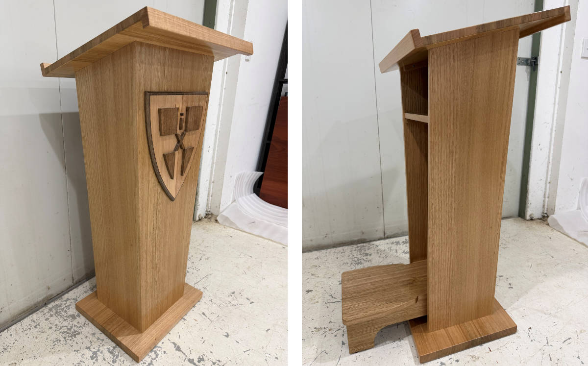 Tasmanian Oak Lectern with an integrated fold-up step and handcrafted school emblem.